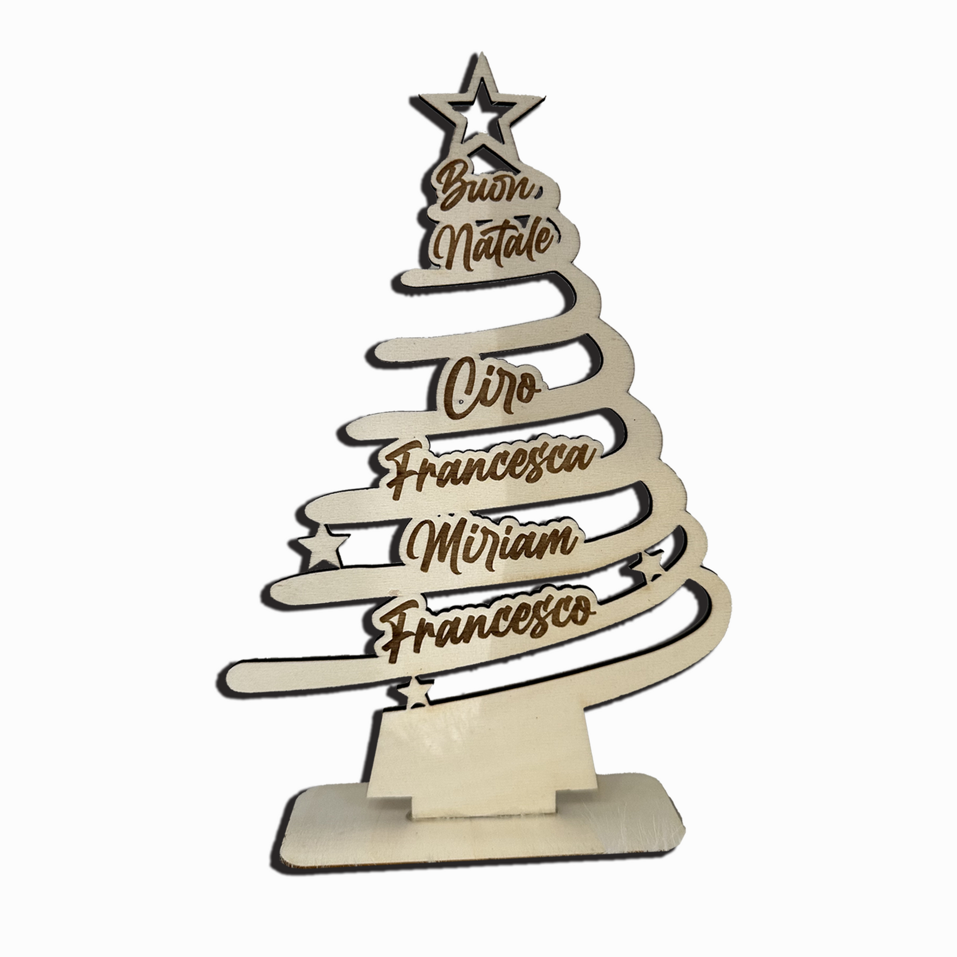Decorazione natalizia realizzata in legno naturale da 4 mm, con incisione dei nomi personalizzati della famiglia o dei nipoti (fino a 5 o 6 nomi).