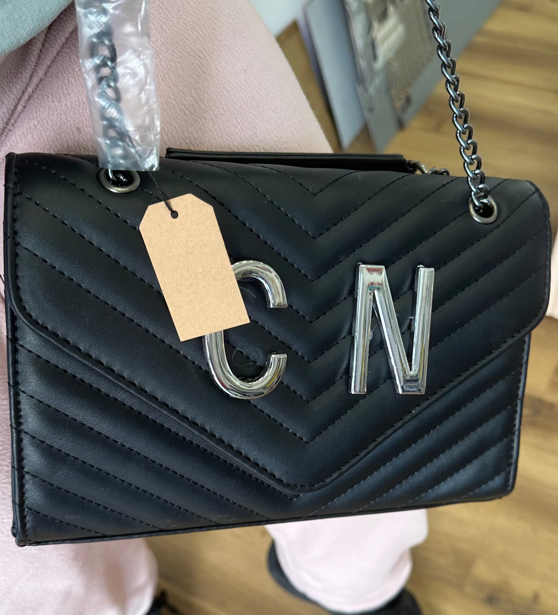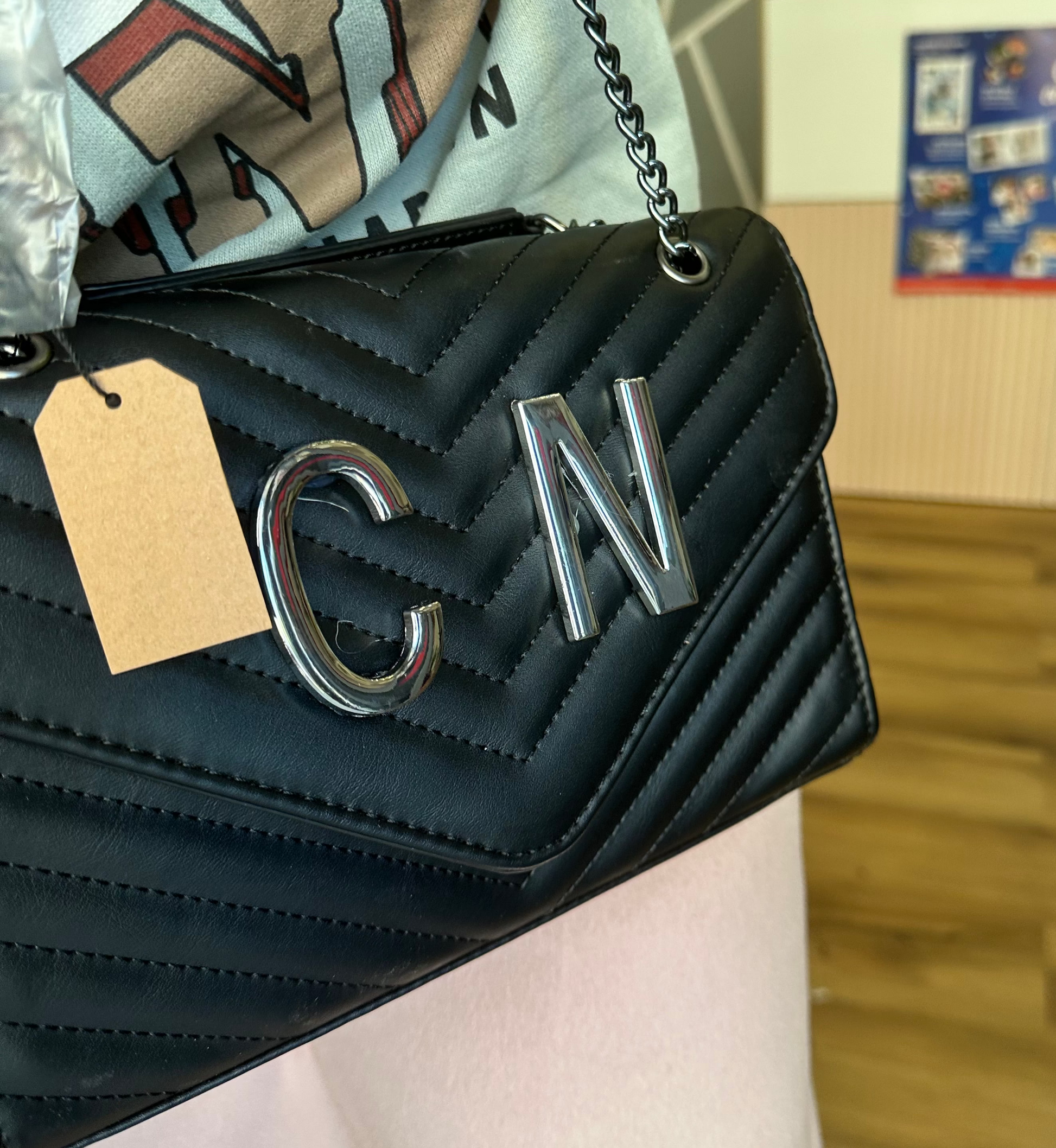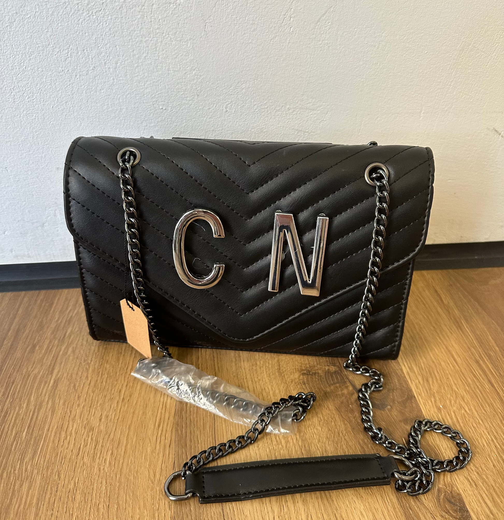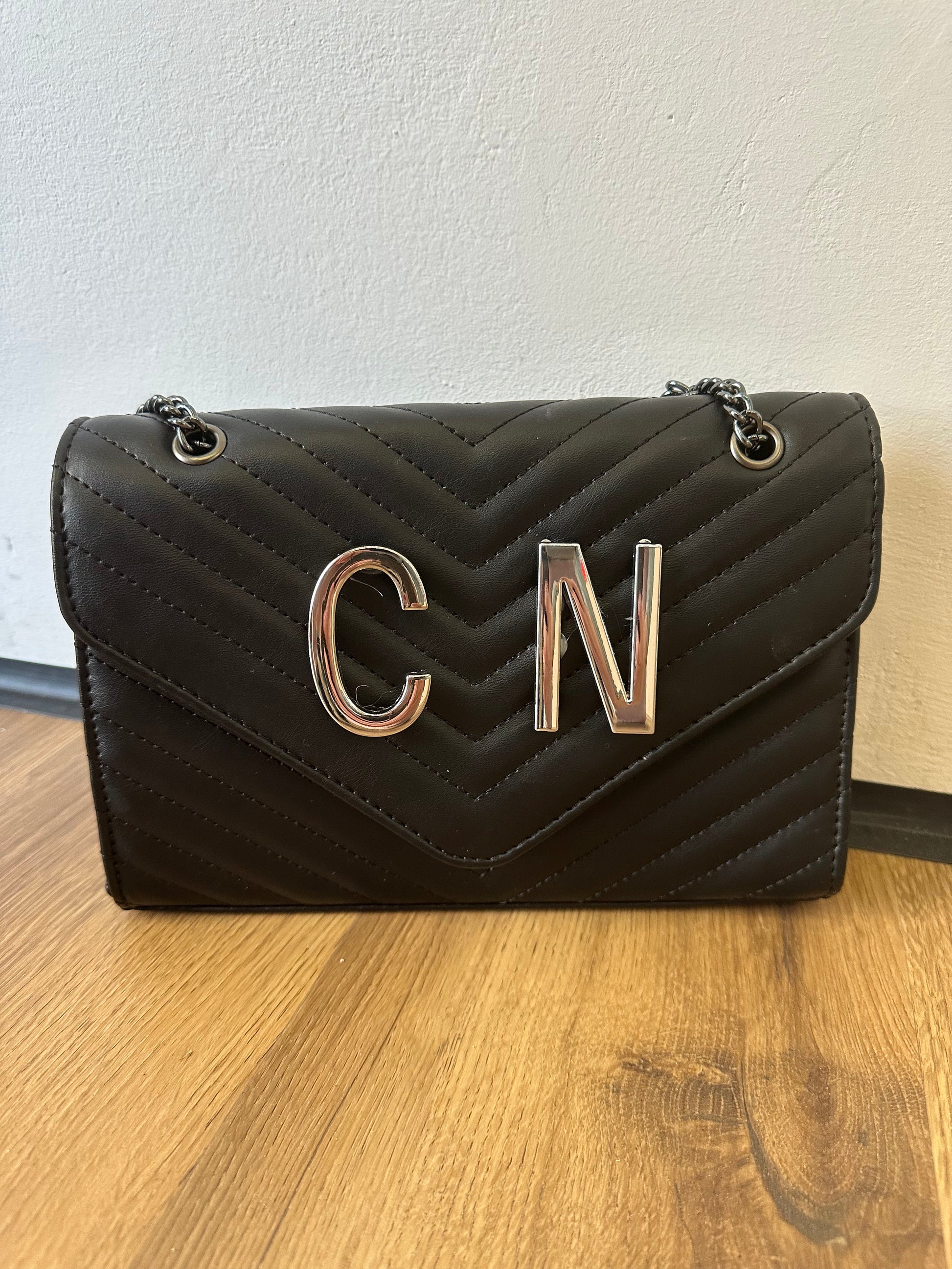Elegante e compatta, questa borsa a tracolla catena si distingue e manico nero per la lavorazione trapuntata e le iniziali in metallo , che donano un tocco distintivo e sofisticato. Perfetta per completare ogni look con stile e personalità.